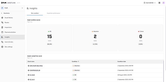 When an complete inspection is Approved, see Approve inspection, it appears in Insight. Users with a Site role see an overview of the site and assets they have access to, how they are being performed, whether they are completed on time or if they are overdue, etc.
